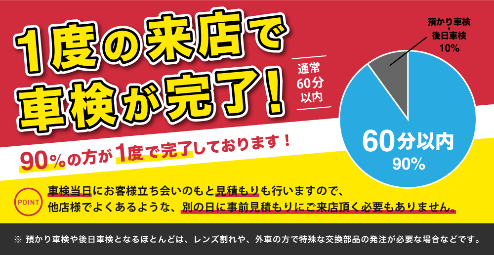 当店は、短時間車検を基本としておりますが、整備箇所が多い場合や部品取り寄せが発生した場合など、短時間で車検が完了できない場合も中にはございます。
