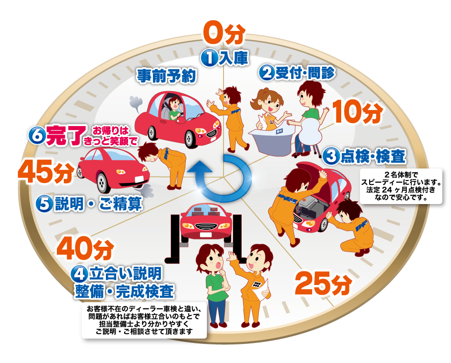 長年積み重ねてきた経験やノウハウによって、車検は以前のように何日もお預かりしなくても、即日完了できるようになりました。